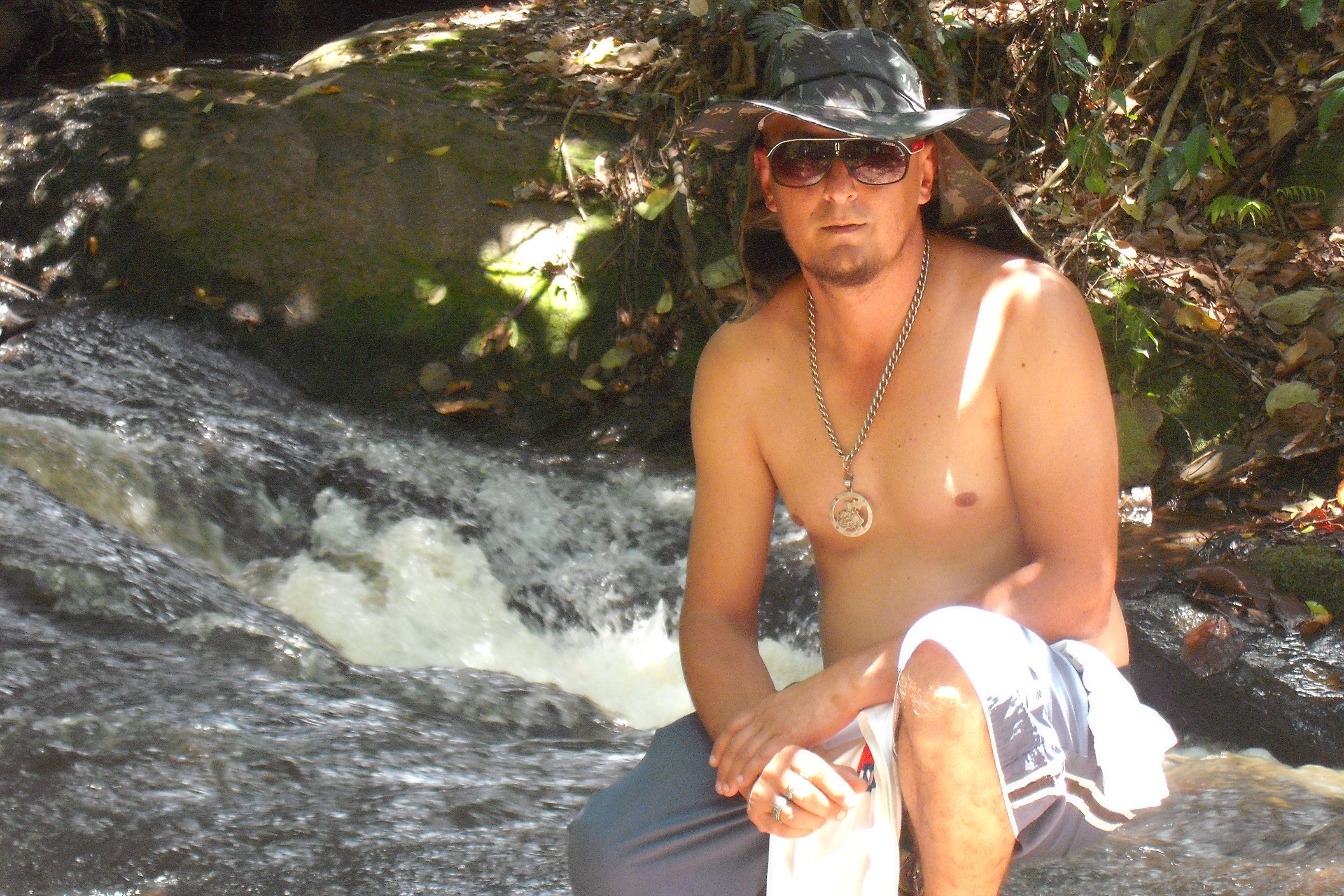 Margeando o rio, uma pequena e perigosa trilha nos leva até outro ponto da corredeira. Como havia chovido alguns dias antes e o lugar é bem coberto por árvores, o solo estava molhado e qualquer descuido poderia levar algum de nós para dentro da água.